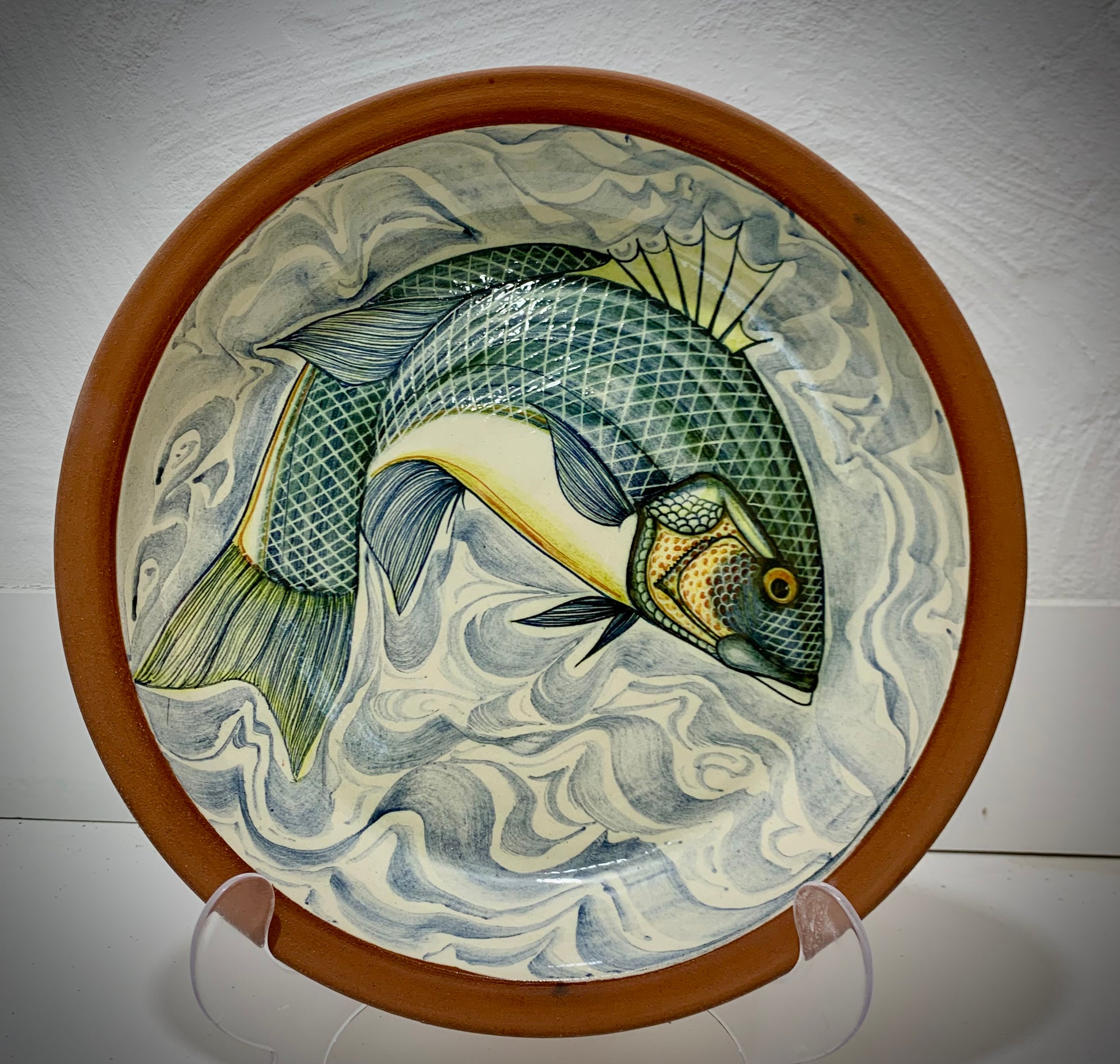 Hand made and decorated terracotta bass charger 36 cm diameter. Display or domestic use.
